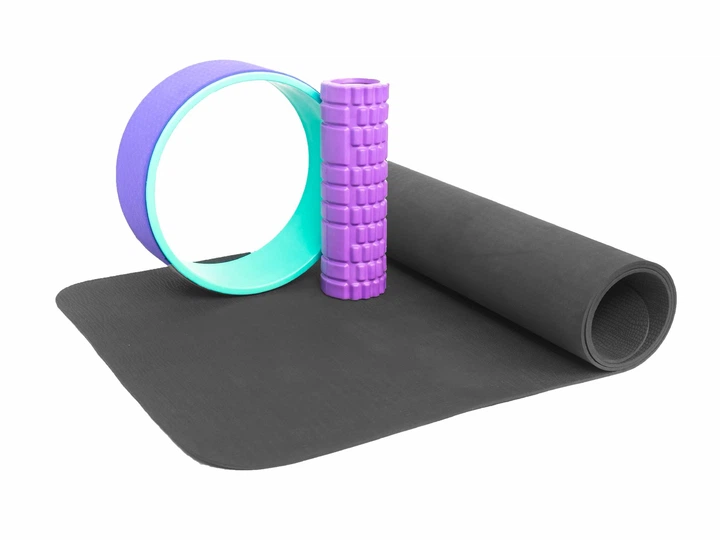 Yoga and fitness set Yoga mat, Yoga wheel 33 cm lilac-mint + massage roller